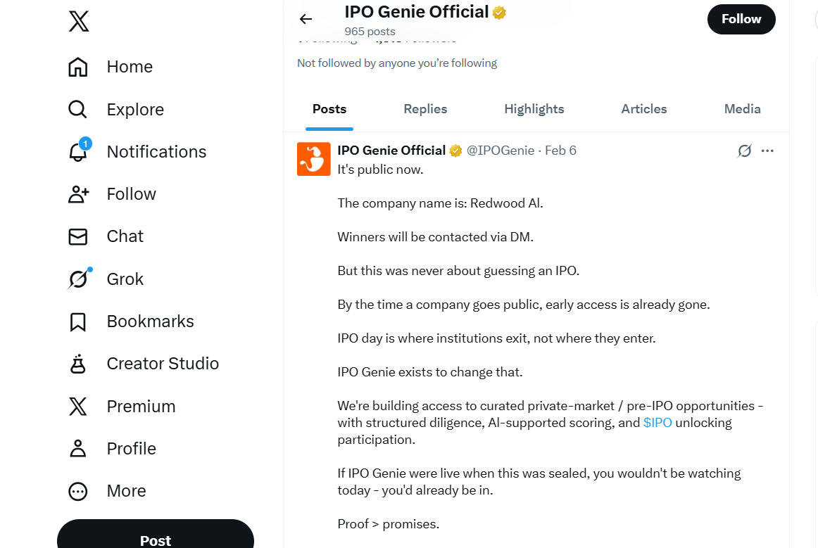 And it’s not just talk. As shown in the linked Twitter post, IPO Genie publicly identified Redwood AI as a pre-IPO opportunity before its name was revealed, then later confirmed it once the information became public. This moment proved that IPO Genie’s AI agents can spot real pre-IPO signals early, not after IPO day hype. That’s why many investors now see $IPO as a top crypto presale with massive upside potential.