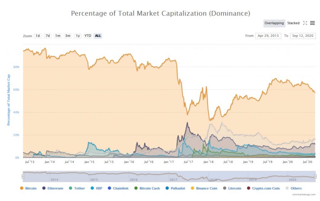 أصبح مقياس هيمنة Bitcoin ذا أهمية متزايدة هذه الأيام، لا سيما في ظل ازدهار DeFi. ففي عام 2017، سجل البيتكوين ارتفاعًا بنسبة 1318%. ومع ذلك، شهد ذلك العام أداءً متميزًا للعديد من العملات الرقمية الأخرى التي تجاوزت البيتكوين في الارتفاع. فعلى سبيل المثال، ارتفع XRP بنسبة 36018%، وزاد سعر ستيلر (XLM) بنسبة 14441%. لكنّ الاعتقاد السائد بأن Bitcoin لا يرتفع بالتزامن مع العملات البديلة لم يعد صحيحًا في عام 2020.
