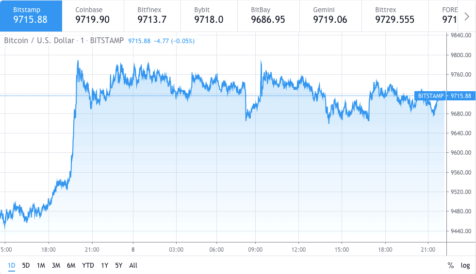 اقتربت العملة الرقمية من مستوى المقاومة قرب 9800 دولار، بينما سجلت أعلى مستوى لها خلال اليوم عند 9813.67 دولار. انخفض سعر البيتكوين نحو مستوى 9680 دولار بعد الساعة 2:00 مساءً بتوقيت غرينتش، ليعود بعدها بساعات قليلة إلى نطاق 9700 دولار. ويتم تداول Bitcoin حاليًا عند 9715.88 دولار أمريكي.