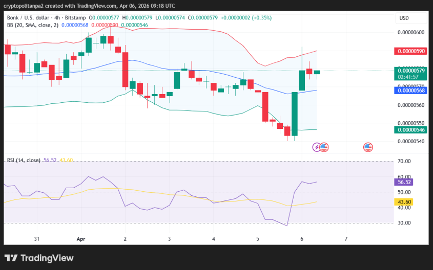 في 6 أبريل 2026، أشار تحليل سعر عملة الميم (Memecoin) من Bonk إلى اتجاه صعودي مع سيطرة المشترين. قفزت العملة إلى 0.00000579 دولار أمريكي بعد أن وجدت دعمًا حول مستوى 0.00000568 دولار أمريكي، مسجلةً ارتفاعًا بنسبة 5% خلال الـ 24 ساعة الماضية. ويعود هذا الارتفاع في القيمة بشكل رئيسي إلى زيادة الإقبال على الشراء دون مستوى المقاومة 0.00000592 دولار أمريكي. إجمالًا، تُشير عملة الميم إلى استمرار الاتجاه الصعودي، مما يُعطي الأمل للمتداولين المتفائلين مع تعافيها من أدنى مستوياتها السعرية لهذا العام.