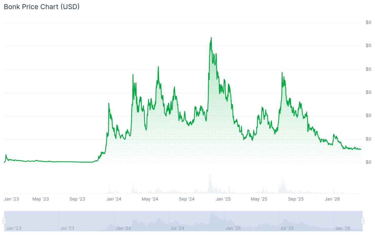 - في بداية يناير 2025، كان يتم تداول عملة Bonk بسعر 0.00002976 دولار، وبعد مزيد من الانخفاض، انخفضت إلى 0.000018 دولار بحلول فبراير، حيث تحولت معنويات السوق إلى سلبية.