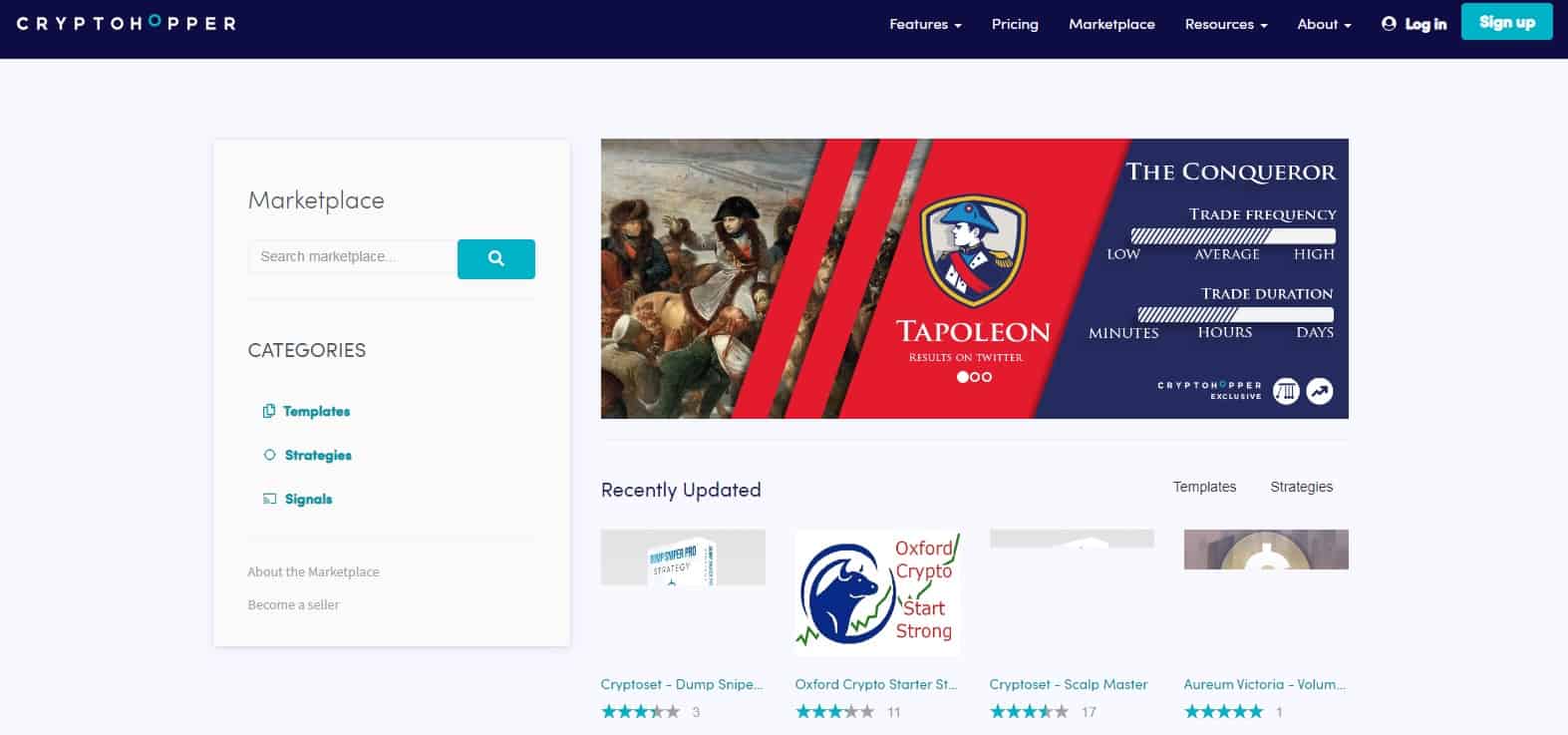 التداول المتطابق ميزة حصرية يقدمها روبوت التداول Cryptohopper. تتيح لك هذه الميزة نسخ استراتيجيات التداول الخاصة بمتداول محترف، ما يعني أن صفقاتك ستُفتح وتُغلق تمامًا مثل صفقاته. مع أن هذه الميزة متاحة مجانًا، إلا أنه يتعين على المستخدمين شراء الاستراتيجيات والقوالب والإشارات التي تساعدهم أثناء التداول اليدوي.