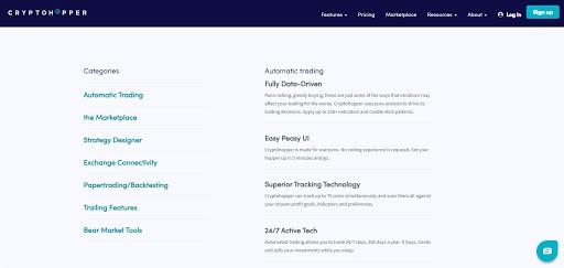 يُساعد برنامج التداول الآلي Cryptohopper المتداولين على cash فرص التداول. وبالمقارنة مع البرامج الأخرى، يُقدم Cryptohopper خدمة متكاملة الميزات، مع منصة سهلة الاستخدام تعتمد على مُولّد إشارات تداول عالي الأداء. لن تضطر بعد الآن إلى الجلوس أمام جهاز الكمبيوتر في انتظار تحقيق الربح.