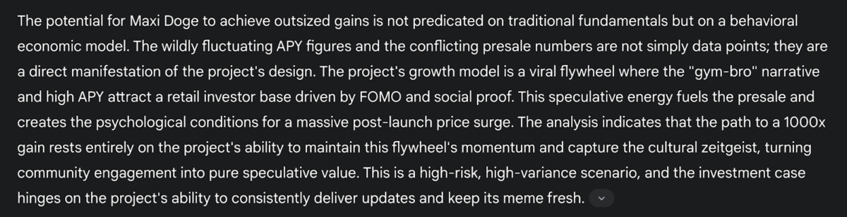 تُشير جيميني أيضًا إلى أن فكرة "الرياضي" التي يتبناها المشروع، بالإضافة إلى مكافآت التخزين المربحة، تُثير حماسًا مضاربيًا "يُغذي عملية البيع المسبق ويُهيئ الظروف النفسية لارتفاع هائل في السعر بعد الإطلاق". تفضل بزيارة ماكسي دوج .