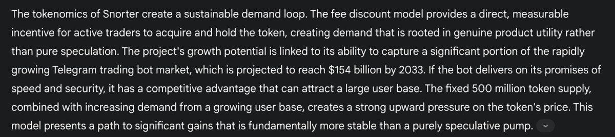 تُشير شركة جيميني إلى أنه للحصول على خصومات على رسوم التداول، يجب على المستخدمين امتلاك عملة SNORT . وتقول إن هذا يخلق "حلقة طلب مستدامة"، وهو ما يُشير، إلى جانب موقعها في قطاع روبوتات التداول سريع النمو، إلى إمكانات واعدة.
