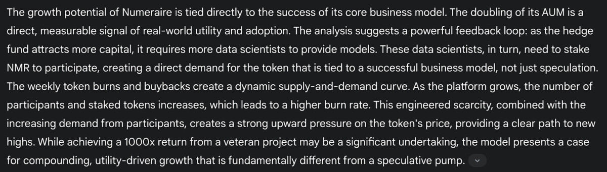 بالإضافة إلى ذلك، يذكر برنامج الدردشة الآلي أن Numeraire لديها ميزات مثل حرق الرموز وعمليات إعادة الشراء، والتي، إلى جانب اعتمادها المتزايد، تشير إلى إمكانية تحقيق مكاسب تصل إلى 1000 ضعف في المستقبل.