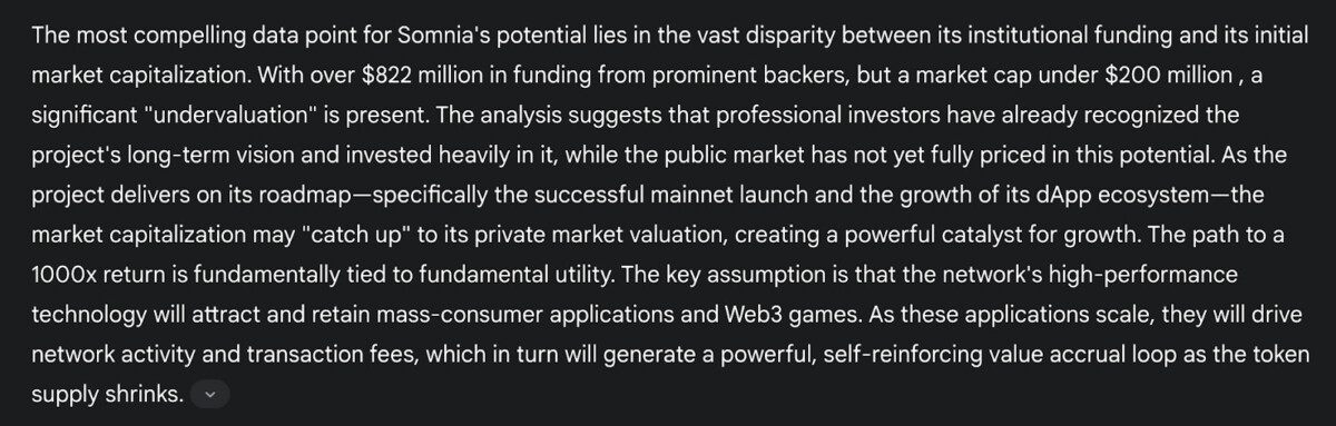 تشير شركة جيميني إلى أن شركة سومنيا قد جمعت تمويلاً يزيد عن 800 مليون دولار، ومع ذلك لا تزال قيمتها السوقية أقل من 200 مليون دولار. وتضيف أن هذه الفجوة الكبيرة، إلى جانب استخدامها المبتكر، تشير إلى إمكانية تحقيق مكاسب كبيرة في المستقبل.