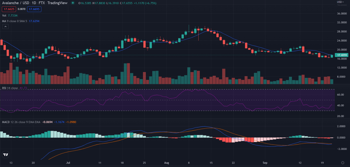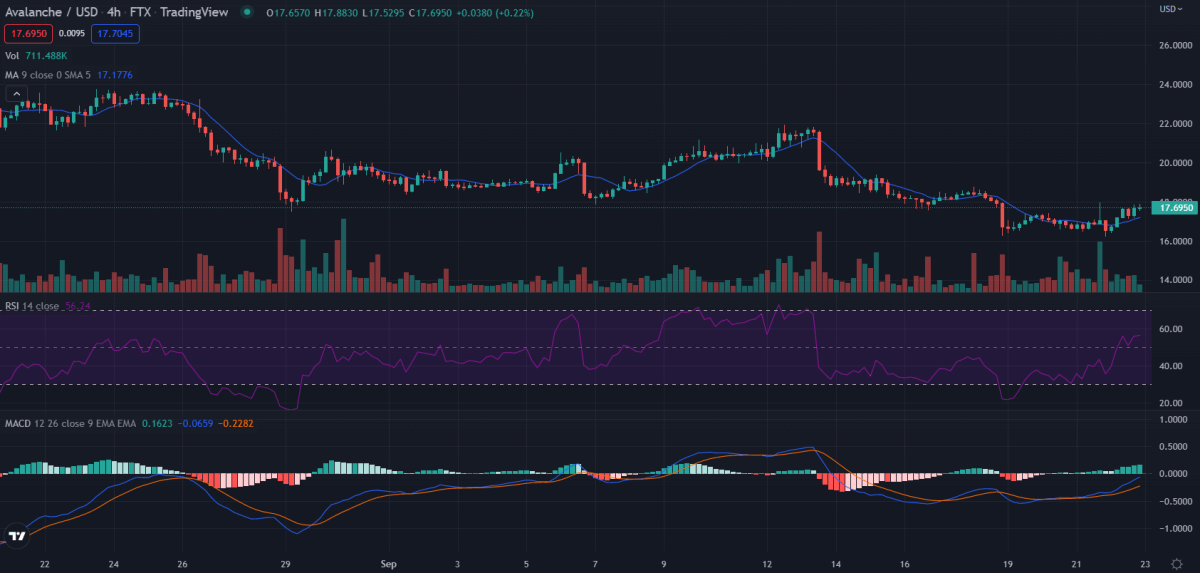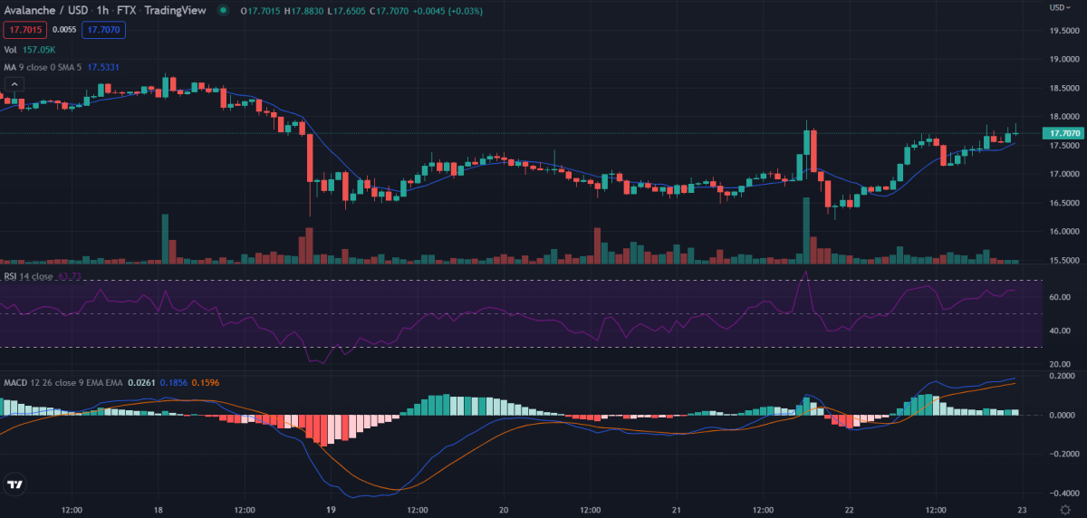 The 1-hour Avalanche price analysis shows that the price closed at $16.6 yesterday. Currently, it is trading at $17.7. It is important to note that this might just be a temporary rally because the market still has a negative sentiment. So, after a slight recovery, Avalanche might be preparing to dip again.