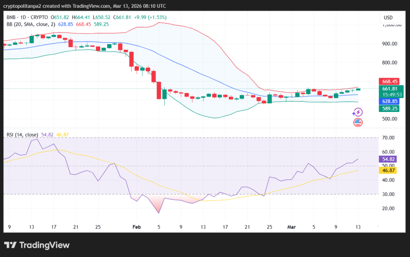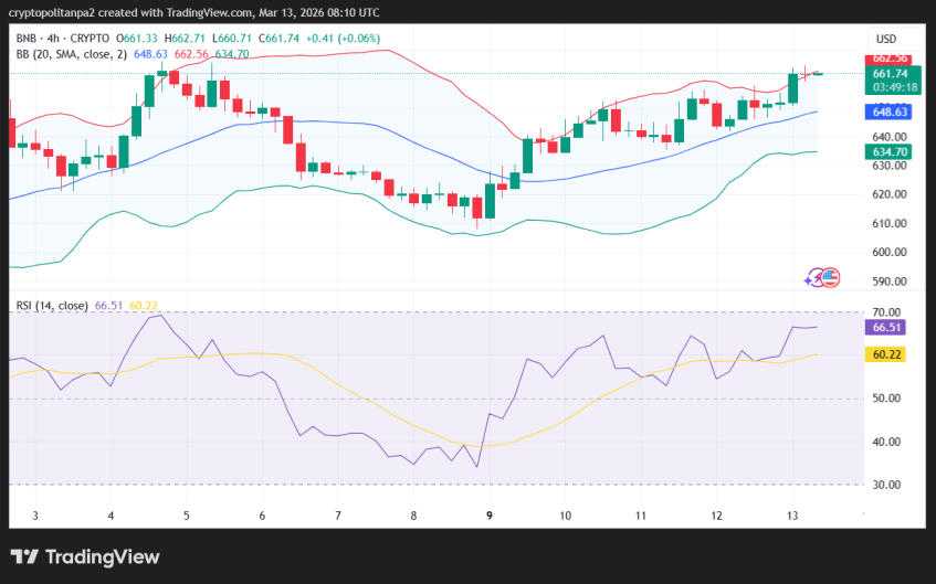 As of March 13, 2026, Binance Coin is showing an uptrend as buyers take over the market. The price analysis reveals the coin saw strong accumulation after finding support at $610. BNB is currently trading at $661.81, gaining 2.36% over the last 24 hours, which is mainly due to today’s upward price action, and is expected to increase over the day.