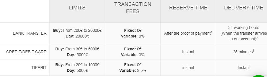 When buying on the Bit2me exchange, you need to consider how long it takes for the transaction to complete. The platform offers three transaction fee options which come with their set limits. These include bank transfers, credit/debit card or TIKEBIT.