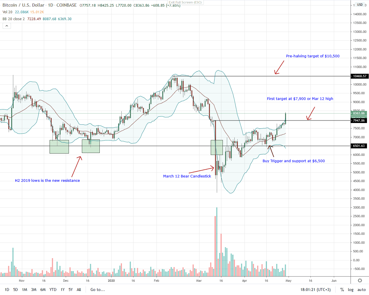 Not only has there been a surge in trading volumes in lower time frames but candlesticks are also banding along with the upper BB hinting of strength. As long as prices hover above $8,000, aggressive traders can search for entry with first targets at Feb 2020 highs of $10,500.