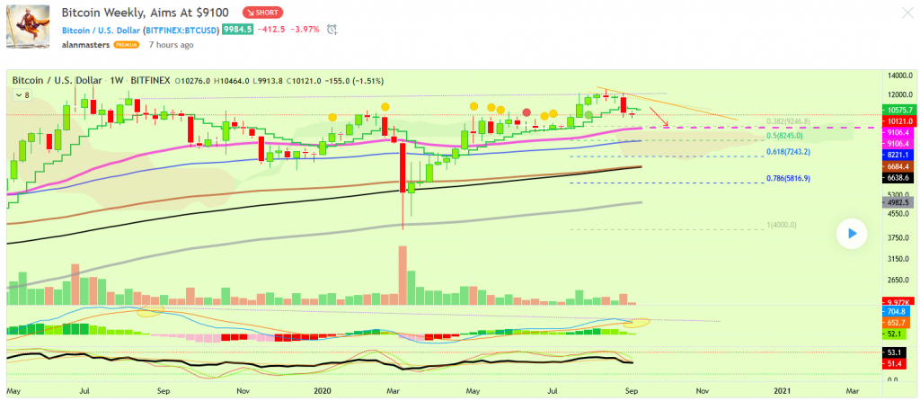 However, Bitcoin price has not displayed any aggressive bullish behavior to bounce from the $10,000 level. Short term bounces can help create a support region from where higher lows can emerge. But trader Alan Masters points out that consecutive lows can signal a bearish momentum taking the Bitcoin price to $9,100.