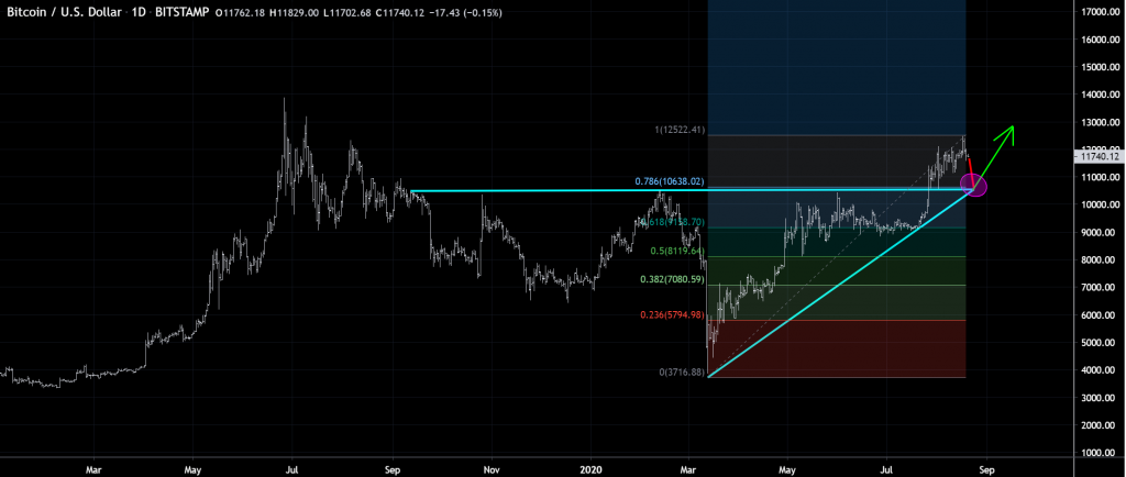 The Bitcoin price line fell below the $11700 level on the 19th of August. Kaotic is a Trading View analyst who is of the opinion that the BTC price will observe a pullback before it will be able to rise past the $12000 mark.