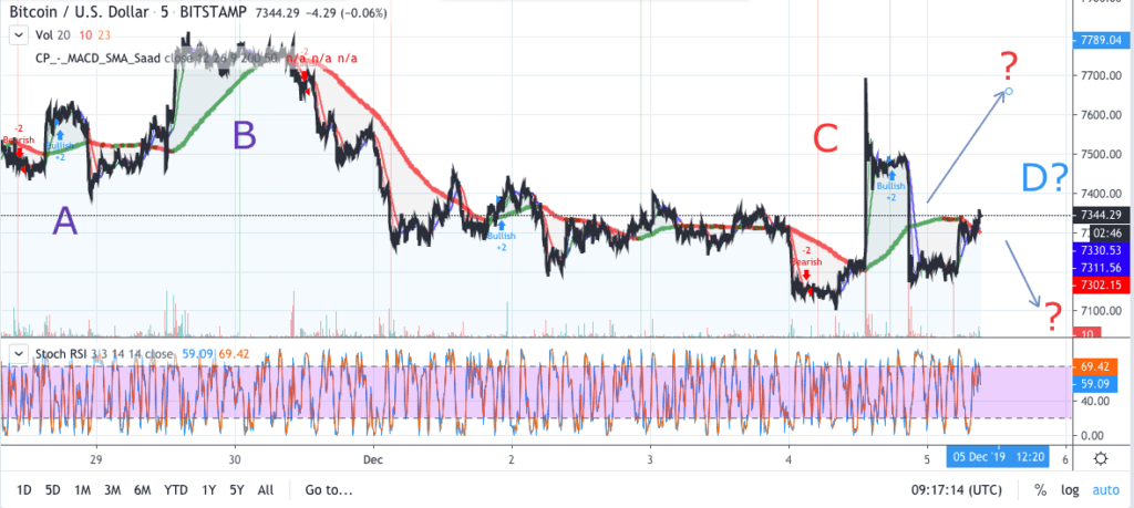 Bitcoin price went through a head, and shoulder pattern on the 29th of November, and the price went up to the $7800 mark. However, at point B in the chart, it turned out to be a looping in the head and shoulder pattern that resulted in a crash below the $7400 mark.
