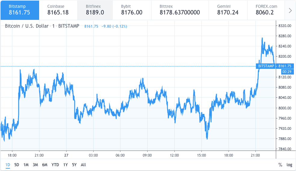 The leading cryptocurrency Bitcoin price currently gaining momentum traded sideways by a little over one percent (1.18%) at around seven thousand nine hundred and seventy dollars ($7970) low mark. Bitcoin price is currently trading at eight thousand one hundred and sixty-one dollars ($8161.75) at the time of writing.