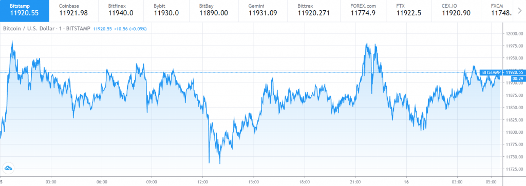 The BTC price stood near the $11700 mark at the beginning of the day’s trade, after which it rose past the $11975 mark and approached a day’s high of $11981.46 US Dollars. At the time of writing, the BTC price was observed at the $11920.55 mark.