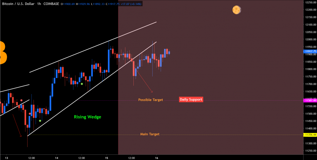 The analyst highlighted a rising wedge pattern for the BTCUSD pair and they suggested that the BTC price will fall below the rising wedge pattern after it observes a breakout towards the downside. The cryptocurrency king has been trading inside the rising wedge pattern from the 13th of August. The idea suggests that if the breakout occurs, the price will either fall towards the $11356.44 mark or towards the daily support that lies at the $11587 level.