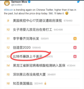 Mow posted screen captures of Chinese Twitter names of the trending topics from Tuesday last week. Using the search name Bitcoin’s drop in price resulted in the thirteenth most viral name on the platform. This should not be a concern since Chinese Twitter has over 400 million active users expressing how eager they are about Bitcoin.