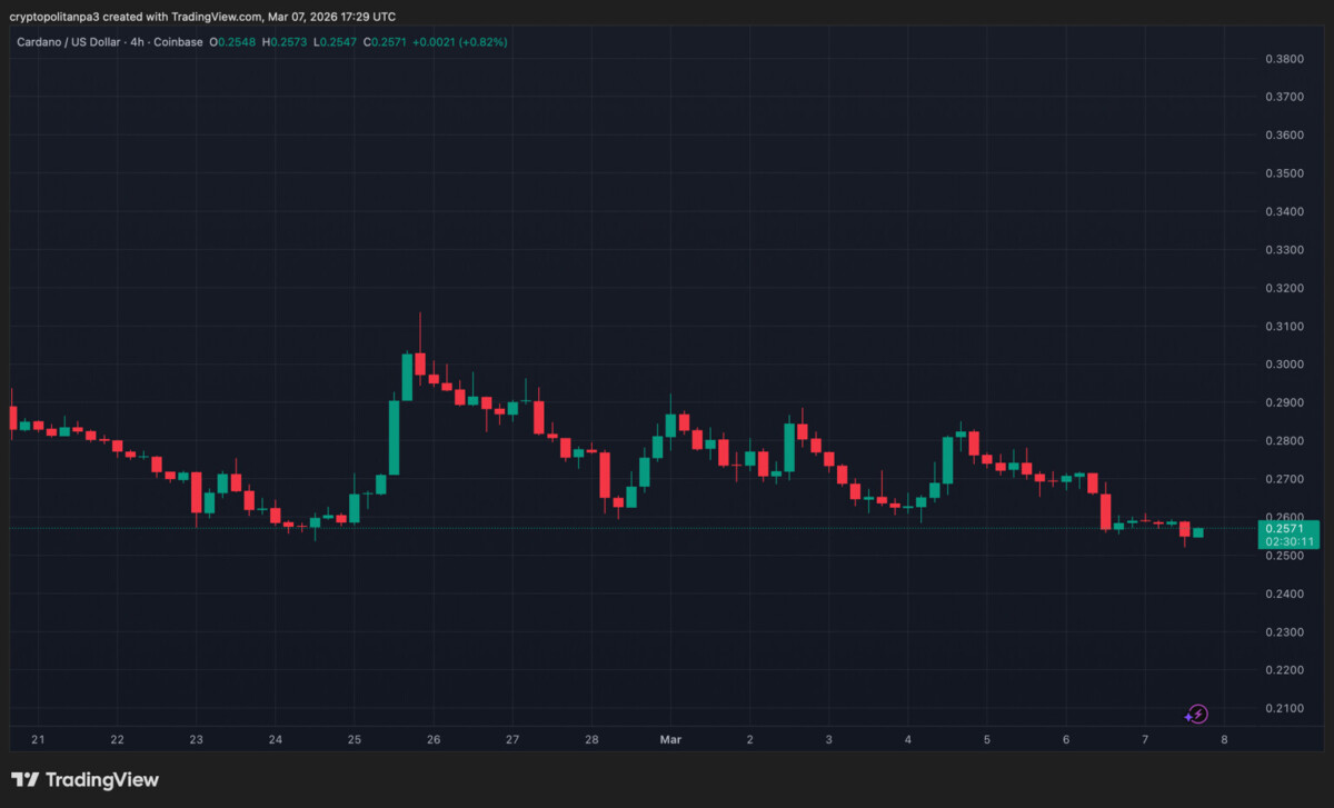 Cardano’s 1-day chart on Mar 7 shows a gradual downtrend after failing to sustain momentum above the $0.30 level. The price recently declined toward the $0.25–$0.26 support zone, indicating persistent selling pressure. Current trading near $0.257 suggests the market is testing a key support area that previously triggered rebounds.