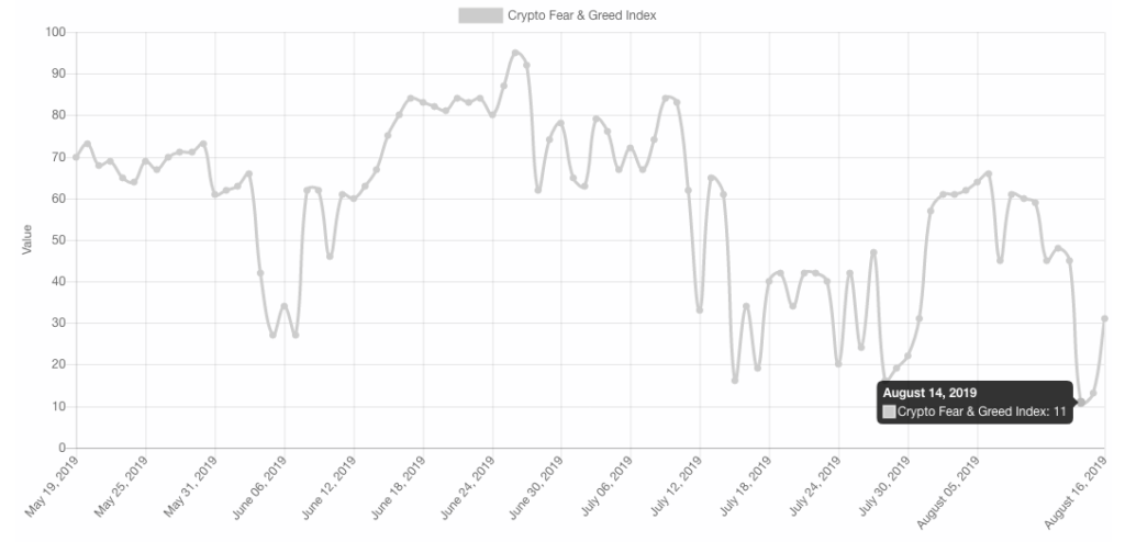 Crypto Greed and Fear Index (CGFI) is just cooling off after hitting the three (3) month high point on the 14th of August, 2019, when the index was down to a score of 11.