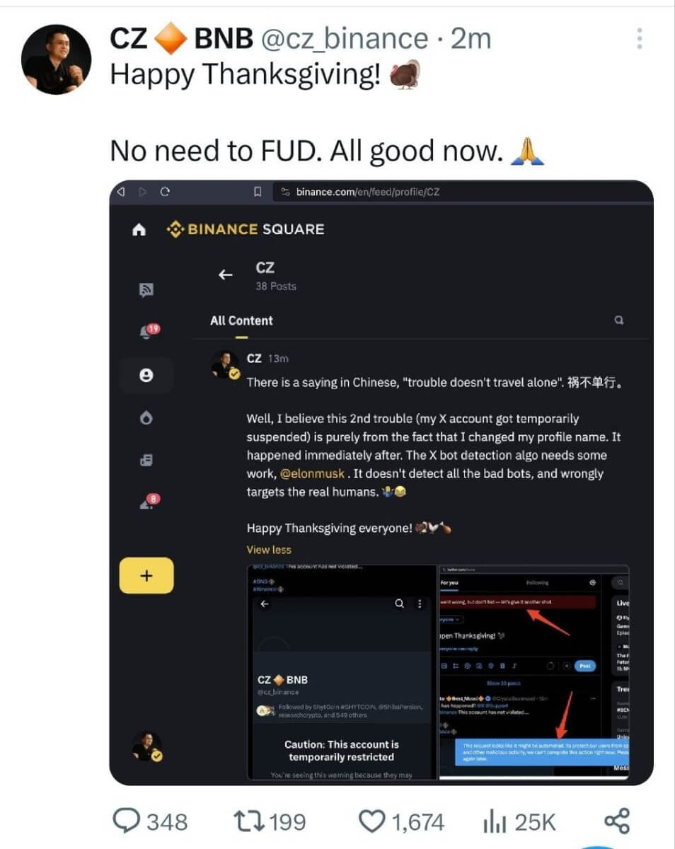 In light of these developments, CZ has attributed the temporary restriction of his account to multiple name changes on the platform, urging the public not to succumb to fear, uncertainty, and doubt (FUD).