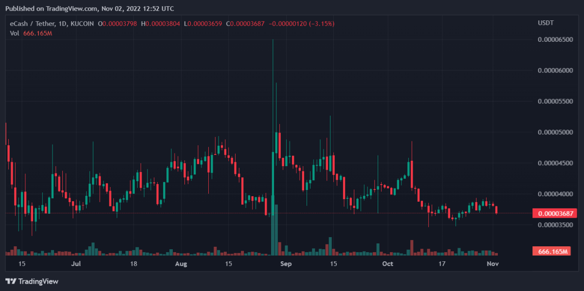 Der Wert von eCash ist im Zuge des anhaltenden Marktrückgangs ebenfalls gesunken. Aktuelle Daten zeigen einen Rückgang von 3,78 % innerhalb der letzten 24 Stunden. Auf Wochensicht beträgt der Verlust 3,29 %. Mit dem allgemeinen Marktrückgang fiel der Kurs von XEC auf etwa 0,00003685 US-Dollar.