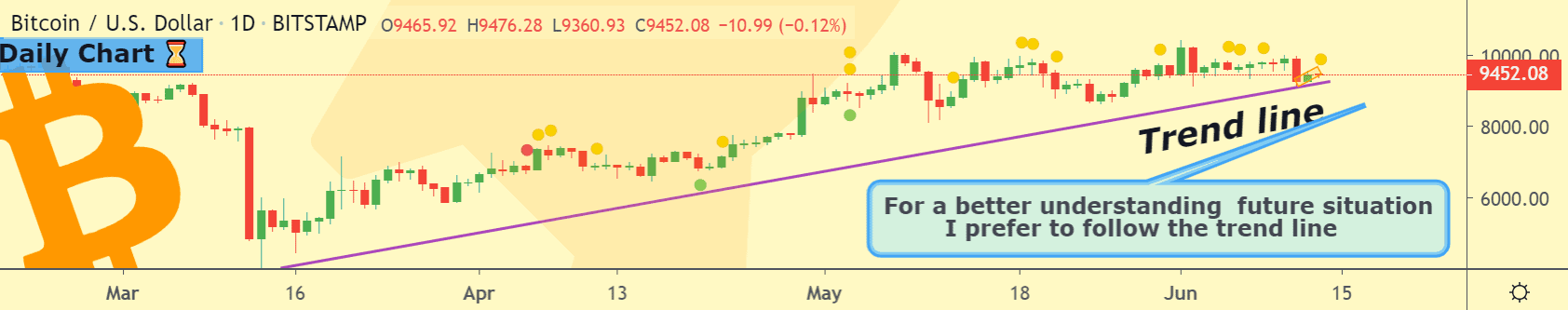 Im Rahmen der Diskussion über die Kursbewegung des BTCUSD-Paares im Tageschart wies Rocket Bomb darauf hin, dass Händler zur besseren Verständlichkeit der Kursbewegung der Kryptowährung die im untenstehenden Chart eingezeichnete steigende Trendlinie betrachten sollten.