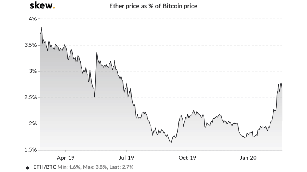 Skews ETH-BTC-Korrelationsdiagramm zeigt, dass Ethereum seit Anfang 2020 Bitcoin entkoppelt hat . Der Korrelationsgrad ist seit Jahresbeginn von 90 auf 74 Prozent gesunken; dies kann erhebliche Auswirkungen auf den Ethereum Kurs während der Altcoin-Saison haben.