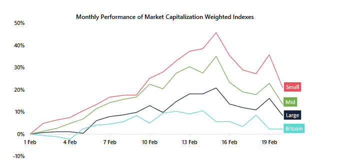 Die obige Grafik zeigt, dass die monatliche Wertentwicklung von digitalen Assets mit mittlerer und geringer Marktkapitalisierung die Bitcoinübertraf. Dies führte laut CoinMarketCap zu einem drastischen Rückgang des Bitcoin-Dominanzindex auf fast 63 Punkte.