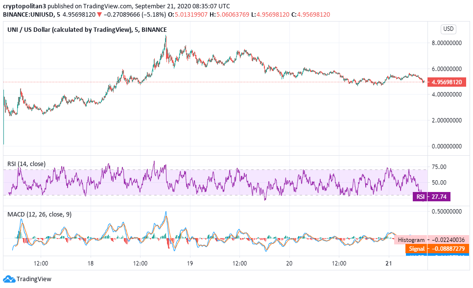 Zum Redaktionsschluss notierten Uni-Token bei 5,09 US-Dollar, nachdem sie am 20. September auf ein Tief von 4,70 US-Dollar gefallen waren. Das UNI/USD-Paar scheint sich jedoch in den letzten Tagen in einem Seitwärtskanal etabliert zu haben.