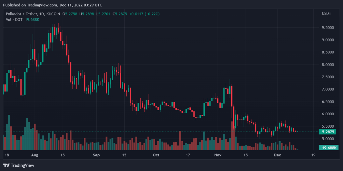 Polkadot también ha mostrado una tendencia bajista, ya que aún mantiene pérdidas. Los últimos datos muestran una caída del 0,12 % en las últimas 24 horas. Los datos de siete días muestran una caída del 4,48 %. El precio de DOT se sitúa actualmente en el rango de los 5,29 $.