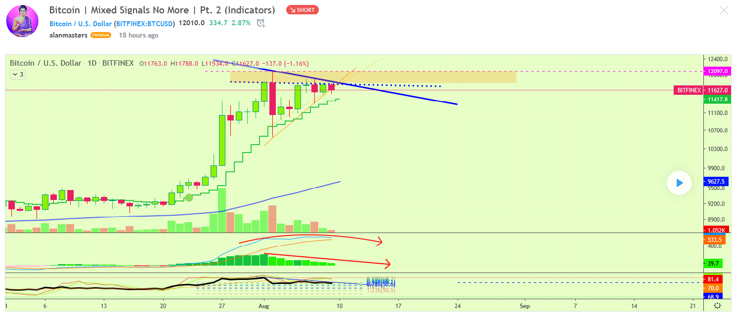 Como señala el operador Alan Masters , el movimiento lateral también puede representar una amenaza a la baja. A la baja, el precio tendría que descender rápidamente por debajo de los $11,800, que ahora actúa como soporte. Además, los $11,500 proporcionarán un tron soporte a cualquier movimiento a la baja y frenarán su caída. Los bajistas representarán una seria amenaza en el nivel de $12,300. Con el ADX en 41, hay un amplio margen para que el precio suba. El +DI también se encuentra con seguridad dent encima del -DI.