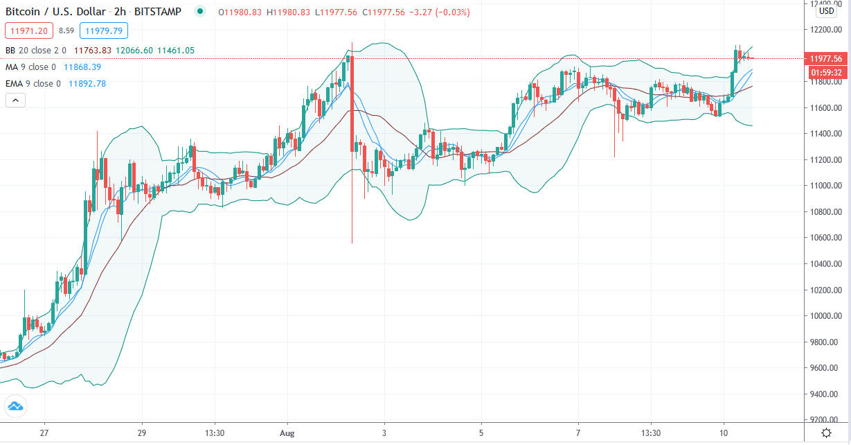 El lunes por la mañana, el precio rompió violentamente la resistencia de $11,800 para registrar un máximo de $12,007. El precio superó esta resistencia en pocas horas, y el patrón de velas muestra unatroncorriente alcista subyacente. Actualmente, está consolidando ganancias al cotizar por encima de la resistencia crítica de $11,800. Otras altcoins, como Ethereum y XRP, también presentan gráficos alcistas con un sesgo alcista.