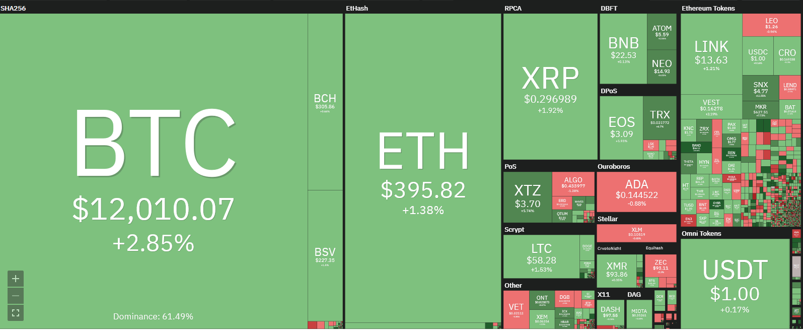 El aumento viene acompañado de un repunte más amplio de las altcoins, que ha llevado los precios de importantes criptomonedas a nuevos máximos. El fin de semana ha sido favorable para el mercado de criptomonedas, ya que un cambio positivo ha marcado el comienzo del movimiento de precios de la mayoría de las altcoins. Con el precio Bitcoin superando la barrera de los $12,000, han resurgido las esperanzas alcistas, lo que marca el final de la fase de consolidación.