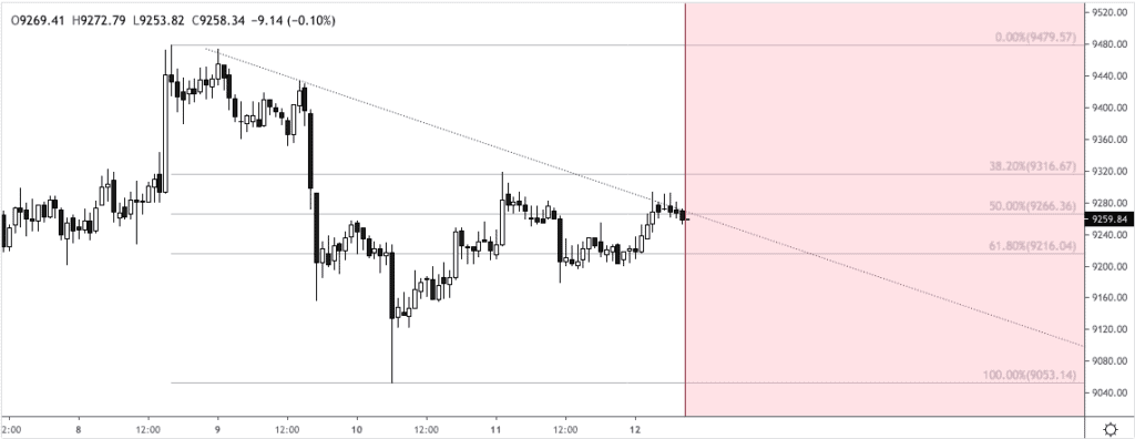 Tras el patrón de cabeza y hombros, el precio Bitcoin cayó a $9128 y se mantuvo en el mismo rango hasta una nueva caída a $9124. Tras el primer movimiento importante, se observó un movimiento de cabeza y hombros más pequeño, cuando el precio Bitcoin volvió a subir a $9303 antes de caer por debajo de $9200.