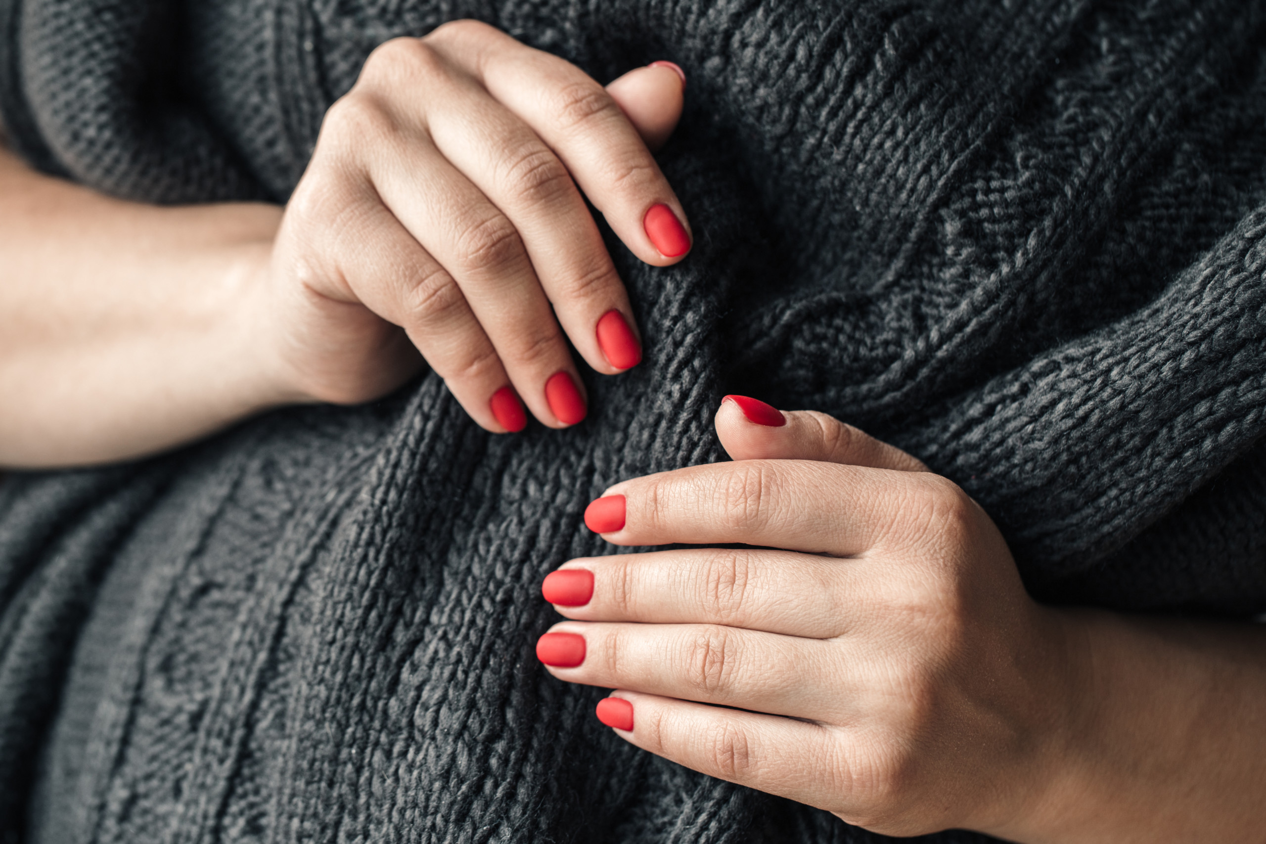 63.0 Una mujer con un suéter de punto oscuro muestra un PNGCQ3X rojo escalado