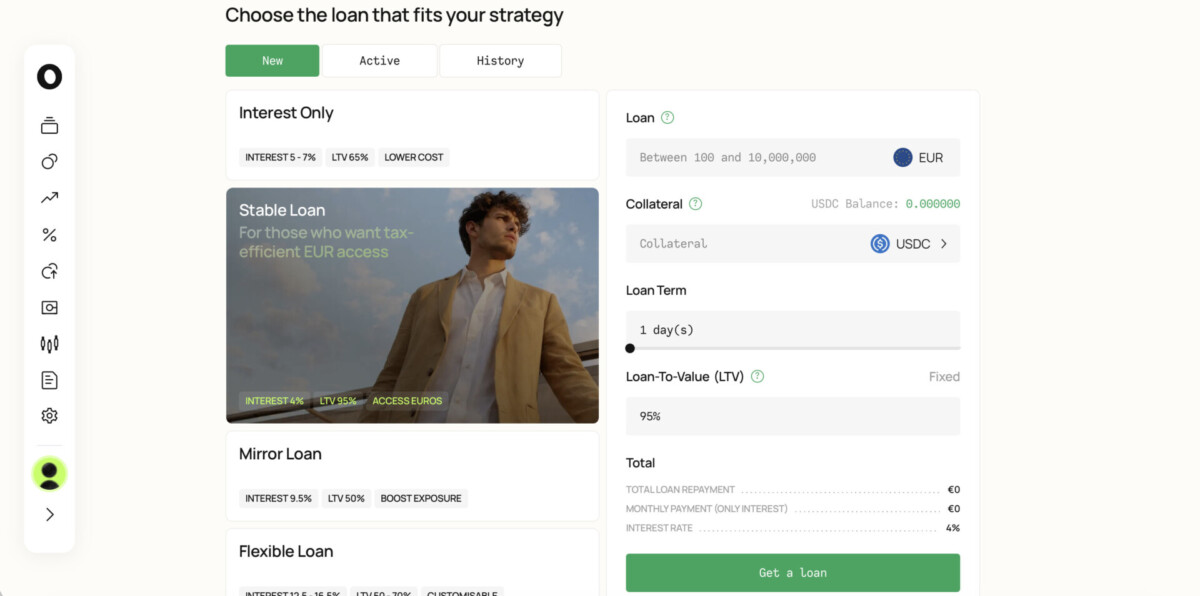 La plataforma se basa en productos como StableLoan y Mirror Loan, cada uno diseñado para diferentes estrategias de préstamo. StableLoan es un préstamo en euros respaldado por stablecoins como USDC o EURC. Dado que la garantía son stablecoins, el préstamo está protegido de las fluctuaciones de precio asociadas a otros criptoactivos. Con un LTV fijo del 95 %, también permite a los usuarios liberar una parte significativa de su capital. Los fondos se abonan primero en la billetera en euros del usuario, desde donde se pueden transferir a un IBAN compatible con criptomonedas , lo que permite un acceso sencillo a la liquidez en moneda fiduciaria.