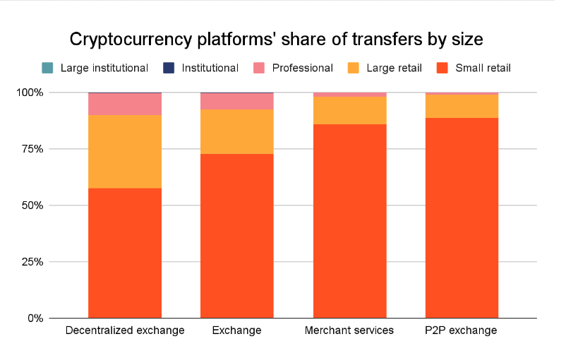 - Las métricas Defi incluyen el valor de la criptomoneda en cadena recibido, el valor minorista en cadena transferido y el volumen de comercio de intercambio entre pares (P2P).
