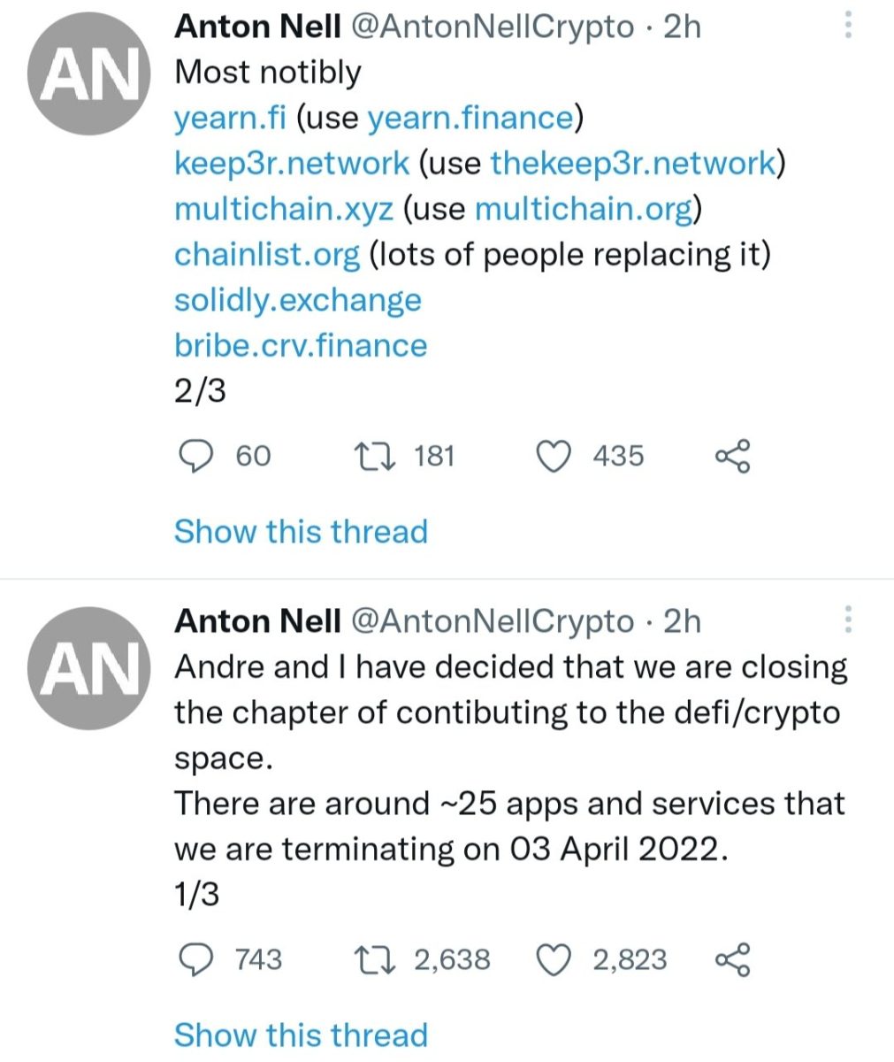 Andre Cronje and his fellow software architect Anton Nell revealed on Twitter they are “closing the chapter of contributing to the DeFi/crypto space” and will terminate their involvement with over 25 decentralized applications on 3rd April.