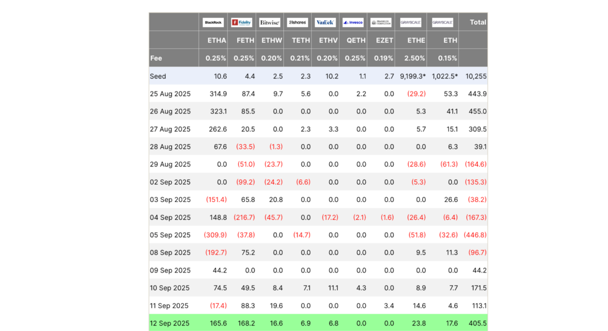 La raison est simple : les flux entrants vers les ETF ont repris. Après un ralentissement des achats d’Ether à Wall Street début septembre, ces achats ont de nouveau fortement progressé, avec une accumulation de 405 millions de dollars d’Ether rien que vendredi.
