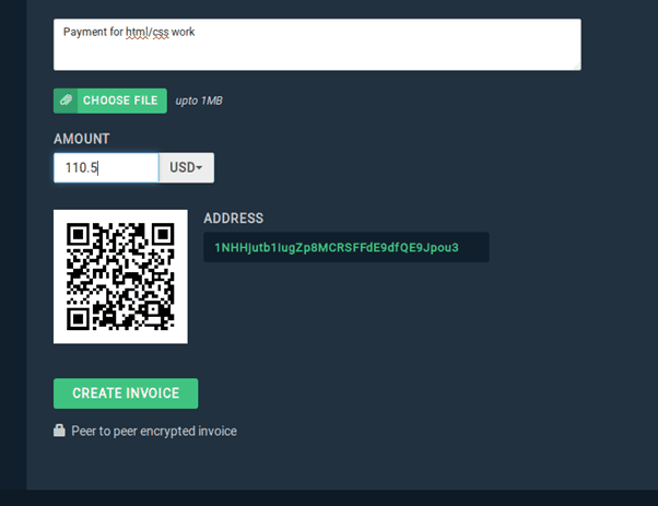 - Une fois le chargement terminé, cliquez sur « Créer une facture P2P ». Blockonomics établira une connexion peer-to-peer que vous pourrez utiliser pour facturer directement votre client dans sa monnaie fiduciaire, convertie en bitcoin.