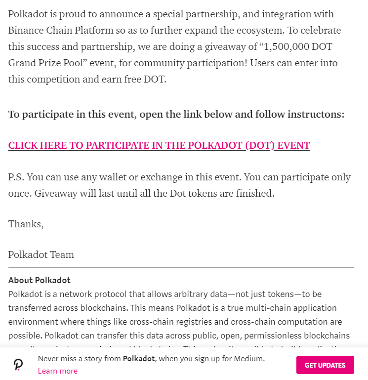 En faisant défiler la page et en cliquant sur ce lien, DOT sont redirigés vers une page proposant un concours frauduleux (voir ci-dessous) . Ce concours promet aux utilisateurs de tripler la quantité de DOT envoyée à l'adresse indiquée.