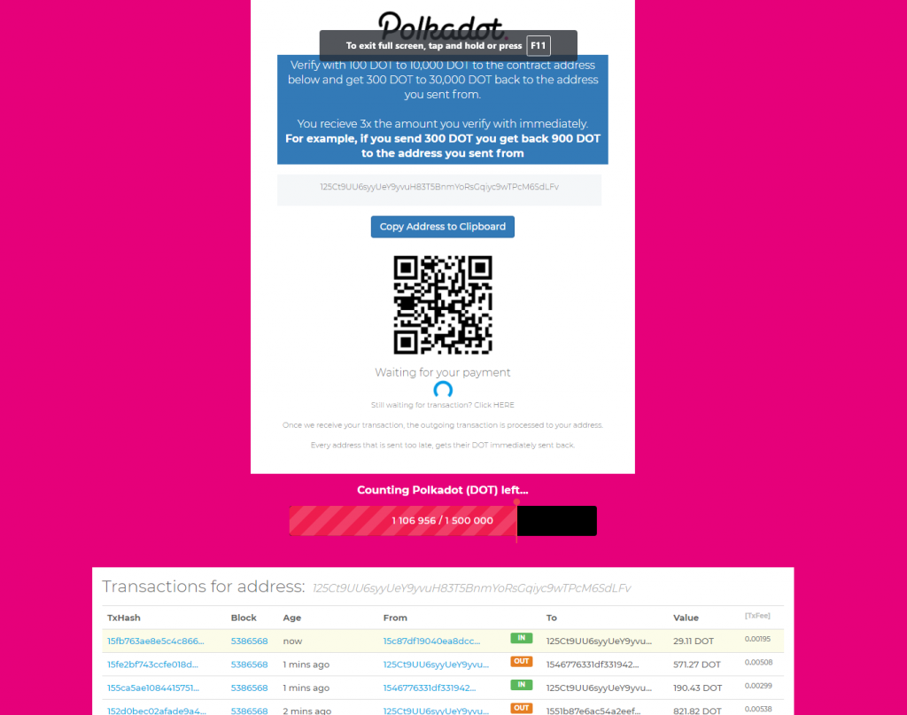 Pour tenter de le prouver, la page web affiche de fausses « transactions en temps réel » et de fausses « valeurs » plus bas sur la page, sous un compte à rebours du DOT restant à distribuer.