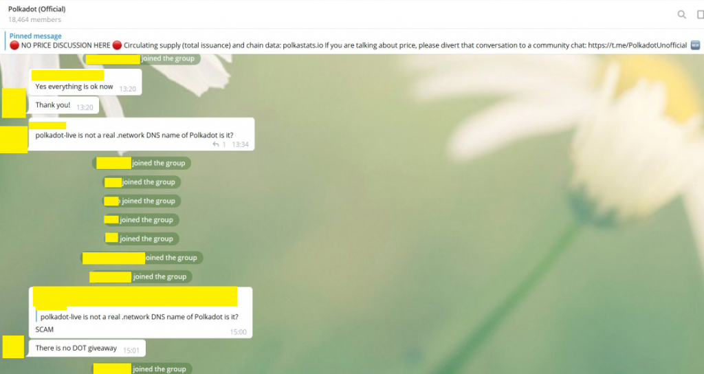 Dans ce groupe, de faux commentaires ont inondé la conversation pour convaincre les membres de son authenticité. À l'heure actuelle, le montant DOT envoyé à cette adresse lors de cette arnaque reste inconnu.