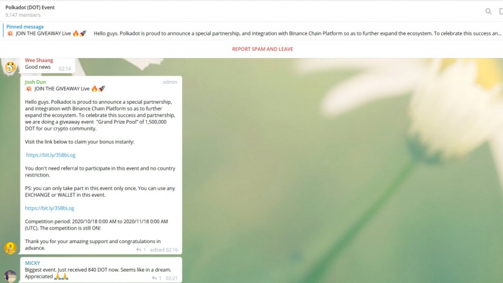 - Un événement promotionnel frauduleux de Polkadot est présenté aux membres du groupe Telegram officiel de Polkadot.