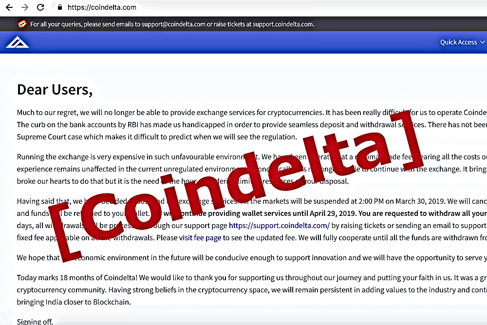 Le 30 mars, Coindelta a officiellement annoncé sa fermeture en raison de la situation des cryptomonnaies en Inde. Bien que l'affaire opposant la Banque de réserve de l'Inde aux cryptomonnaies soit actuellement devant les tribunaux indiens, l'audience a été reportée.