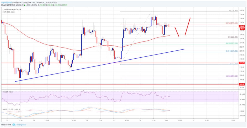 Néanmoins, la moyenne mobile simple (SMA) à 100 heures, à 224 $, a limité la baisse. Le support suivant s'est situé à 223 $, correspondant autracde Fibonacci de 61,8 %. De plus, on s'attend à ce que le prix affiche une tendance haussière plus marquée et puisse atteindre 239 $. Il pourrait même grimper jusqu'à 250 $ sur le graphique horaire de Ethereum par rapport au dollar américain si la tendance haussière se maintient.