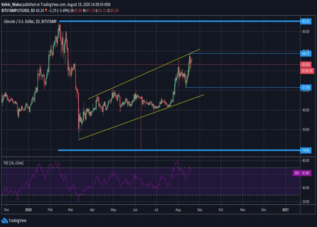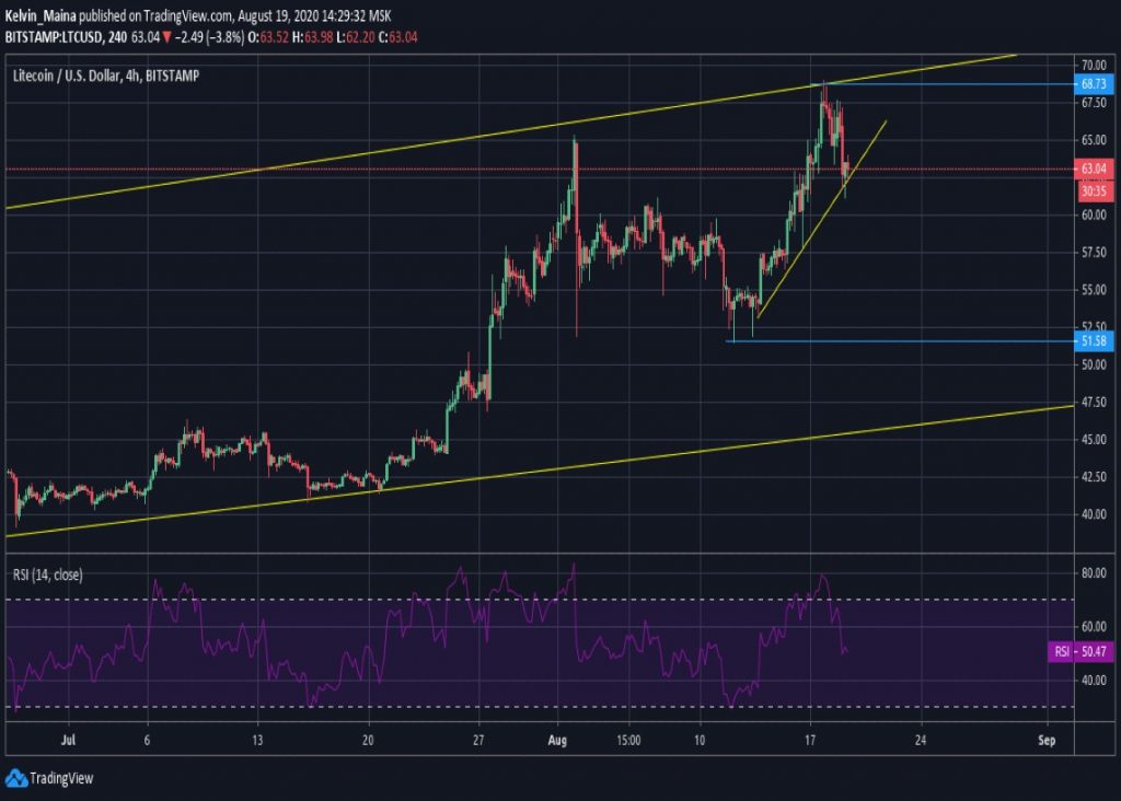 Litecoin semble se diriger vers une chute sous la barre des 60 $, après une semaine de hausse. À partir du 12 août, la cryptomonnaie a établi un support à 51 $, qu'elle a testé à nouveau le 13 août, amorçant ainsi une tendance haussière pendant les cinq jours suivants.