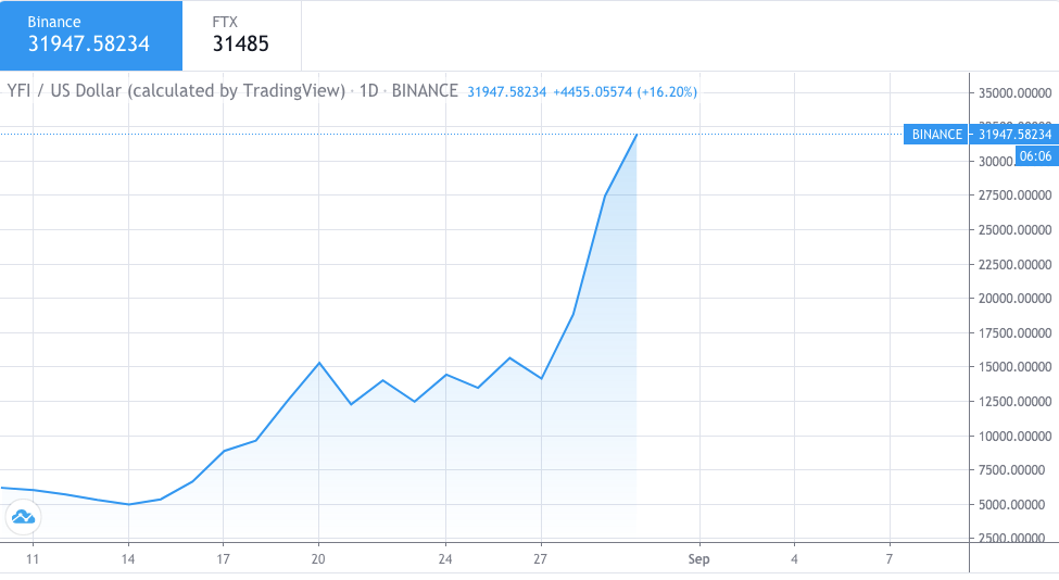 Le token YFI, basé sur le projet DeFi Yearn.Finance, semble être le nouveau roi des cryptomonnaies après avoir enregistré une hausse fulgurante de 3 500 % en moins de deux mois. Coté sous la barre des 1 000 $ à la mi-juillet 2020, il a connu une ascension spectaculaire au cours du mois et demi suivant, atteignant les 40 000 $. Bien que ce pic ait été temporaire, le token se maintient autour de 31 000 $ après sa chute. Cette progression fulgurante, de 1 000 $ à 40 000 $, a attiré l'attention des analystes, et TradingView l'a ajouté à son catalogue de graphiques.
