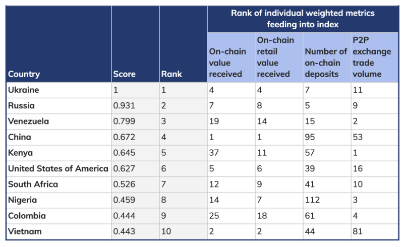 D'après les dernières données publiées par Chainalysis, le taux d'adoption des cryptomonnaies aux États-Unis est bien inférieur à celui de la Russie et de la Chine. L' Indice mondial d'adoption des cryptomonnaies 2020 , également publié par Chainalysis, classe les pays selon leurs politiques et réglementations en matière d'adoption des cryptomonnaies. À la surprise générale, l'Ukraine arrive en tête du classement, suivie de près par la Russie.
